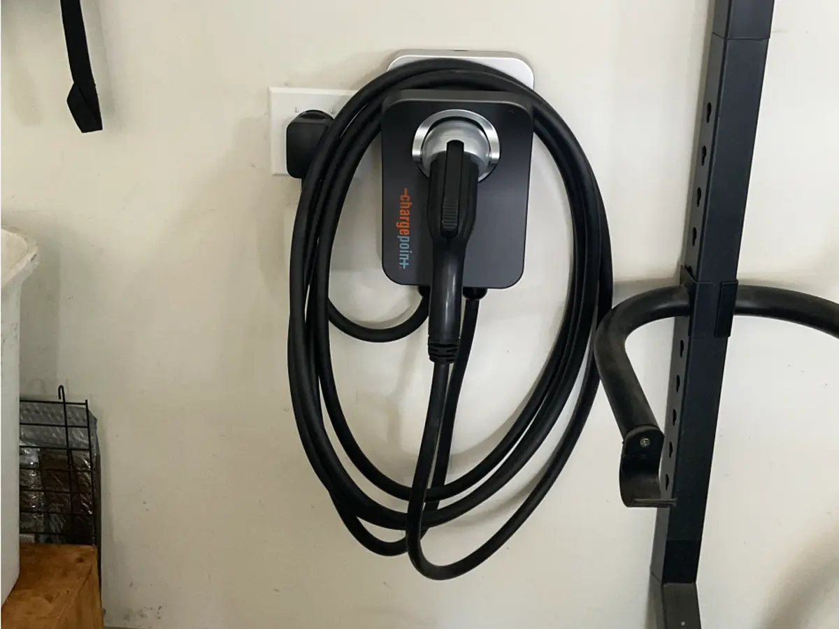 Wall-mounted ChargePoint EV charger with coiled charging cable in a garage.