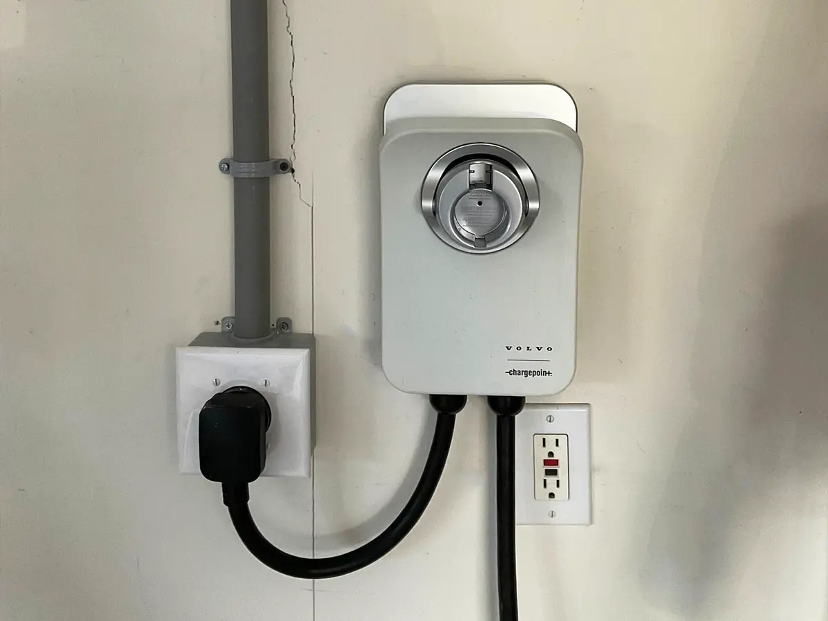 Volvo-branded ChargePoint EV charger mounted on garage wall.
